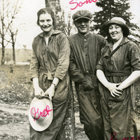 A photograph of three Pacific University students dressed up for Clean-Up Day in 1917. Two are women dressed in men's clothing. The third is a man dressed as a hobo. The caption with the photograph identifies the students as Greta McIntyre Sheeley, Mamie Loomis and Sam Cox. Clean-Up Day was a long-held tradition at Pacific University. One day a year in late fall, students and staff would gather at Marsh Hall before repairing and beautifying the campus. Students would often dress as hobos, farmers or cross-dress. This picture appears in an album that was compiled by Greta McIntyre Sheeley, a 1920 Pacific University graduate.