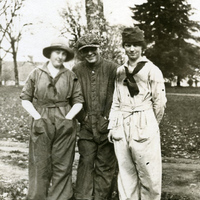 A photograph of Pacific University students posing against a tree, dressed up for Clean-Up Day in 1917. Two female students are dressed like men. The male student is dressed like a hobo. The students are probably Sam Cox, Mamie Loomis and Beth Potwin. Clean-Up Day was a long-held tradition at Pacific University. One day a year in late fall, students and staff would gather at Marsh Hall before repairing and beautifying the campus. Students would often dress as hobos, farmers or cross-dress. This picture appears in an album that was compiled by Greta McIntyre Sheeley, a 1920 Pacific University graduate.