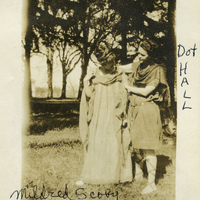 A photograph of two Pacific University students dressed up for the Pacific University play Pygmalion and Galatea in 1919. The caption with the photograph identifies the students as Dorothy Hall and Mildred Scobee Reeher. The Philomathean Society of Pacific University put on the production in an effort to support two French orphans. The play was performed in Marsh Hall on April 10th, 1919. The Philomathean Society at Pacific University was founded in 1871. They believe they are the oldest sorority west of the Mississippi. This picture appears in an album that was compiled by Greta McIntyre Sheeley, a 1920 Pacific University graduate.