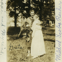 A photograph of two Pacific University students dressed up for the Pacific University play Pygmalion and Galatea in 1919. The caption with the photograph identifies the students as Greta McIntyre Sheeley and Mildred Scobee Reeher. The Philomathean Society of Pacific University put on the production in an effort to support two French orphans. The play was performed in Marsh Hall on April 10th, 1919. This picture appears in an album that was compiled by Greta McIntyre Sheeley, a 1920 Pacific University graduate.