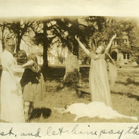 A photograph of a group of female Pacific University students reenacting a scene from the Pacific University play Pygmalion and Galatea in 1919. The Philomathean Society of Pacific University put on the production in an effort to support two French orphans. The play was performed in Marsh Hall on April 10th, 1919. The Philomathean Society at Pacific University was founded in 1871. They believe they are the oldest sorority west of the Mississippi. This picture appears in an album that was compiled by Greta McIntyre Sheeley, a 1920 Pacific University graduate.