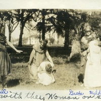 A photograph of the cast of Pacific University play Pygmalion and Galatea reenacting a scene, with Marsh Hall and Old College Hall visible in the background in 1919. The caption with the photograph identifies the students as Greta McIntyre Sheeley, Mildred Scobee Reeher and Dorothy Hall. The Philomathean Society of Pacific University put on the production in an effort to support two French orphans. The play was performed in Marsh Hall on April 10th, 1919. The Philomathean Society at Pacific University was founded in 1871. They believe they are the oldest sorority west of the Mississippi. This picture appears in an album that was compiled by Greta McIntyre Sheeley, a 1920 Pacific University graduate.