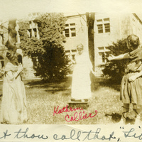 A photograph of three female Pacific University students reenacting a scene from the Pacific University play Pygmalion and Galatea in front of Marsh Hall in 1919. The caption with the photograph identifies one student as Katheryn Collier. The Philomathean Society of Pacific University put on the production in an effort to support two French orphans. The play was performed in Marsh Hall on April 10th, 1919. The Philomathean Society at Pacific University was founded in 1871. They believe they are the oldest sorority west of the Mississippi. This picture appears in an album that was compiled by Greta McIntyre Sheeley, a 1920 Pacific University graduate.