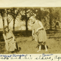 A photograph of two Pacific University students reenacting a scene from the Pacific University play Pygmalion and Galatea in 1919. Old College Hall and Marsh Hall are visible in the background. The caption identifies the students as Bessie Smith and Margaret Morgan. The Philomathean Society of Pacific University put on the production in an effort to support two French orphans. The play was performed in Marsh Hall on April 10th, 1919. The Philomathean Society at Pacific University was founded in 1871. They believe they are the oldest sorority west of the Mississippi. This picture appears in an album that was compiled by Greta McIntyre Sheeley, a 1920 Pacific University graduate.