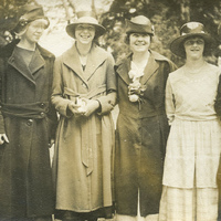 A photograph of five female Pacific University students wearing long trench style coats and hats. During this time period many men from Pacific University were enlisted in military service as the United States entered World War I in April, 1917. The student body was almost entirely made up of women. This picture appears in an album that was compiled by Greta McIntyre Sheeley, a 1920 Pacific University graduate.