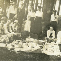A photograph of Henry Liberty Bates with a group of students on at a picnic. Henry Liberty Bates was a beloved professor at Pacific University where he taught Education and Philosophy. He served as the last principal of the Tualatin Academy before it closed in 1915. During this time period many men from Pacific University were enlisted in military service as the United States entered World War I in April, 1917. The student body was almost entirely made up of women. This picture appears in an album that was compiled by Greta McIntyre Sheeley, a 1920 Pacific University graduate.