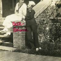 A photograph of a Pacifc University student sitting on the stair railing of second Herrick Hall, with another student in a navy uniform. During this time period many men from Pacific University were enlisted in military service as the United States entered World War I in April, 1917. The student body was almost entirely made up of women. Herrick Hall was the second women's dormitory on the Pacific University campus. It was built in 1907 after it's predecessor burned down. This picture appears in an album that was compiled by Greta McIntyre Sheeley, a 1920 Pacific University graduate.
