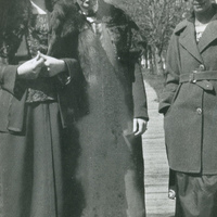 A photograph of two Pacific University students with Mrs. W. C. Hervey, standing on a wood plank walkway. During this time, Mrs. W. C. Hervey was the secretary for the Pacific University president. The caption with the photograph identifies the students as Greta McIntyre Sheeley and Dorothy Hall. During this time period many men from Pacific University were enlisted in military service as the United States entered World War I in April, 1917. The student body was almost entirely made up of women. This picture appears in an album that was compiled by Greta McIntyre Sheeley, a 1920 Pacific University graduate.