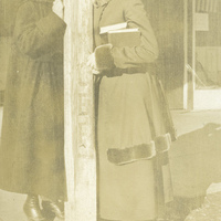 A photograph of two Pacific University students peeking at each other around a wooden post. The caption with the photograph identifies the students as Greta McIntyre Sheeley and Dorris Mace. This picture appears in an album that was compiled by Greta McIntyre Sheeley, a 1920 Pacific University graduate.