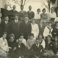 A photograph of the freshman class at Pacific University in 1920. A caption with the photograph identifies several students as Lois Payne, Ellen Anderson, Leslie 'Jazz' Hoar and Hazel Jones. This picture appears in an album that was compiled by Greta McIntyre Sheeley, a 1920 Pacific University graduate.