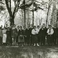 A photograph of a group of Pacific University students, in a grove of trees. This picture appears in an album that was compiled by Greta McIntyre Sheeley, a 1920 Pacific University graduate.
