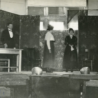 A photograph of students performing the Freshman play on stage in 1920. This picture appears in an album that was compiled by Greta McIntyre Sheeley, a 1920 Pacific University graduate.