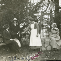 A photograph of students performing the Freshman play outside. They are in costume and their props include a well and a bench. The caption with the photograph identifies the students as Glenn Sheeley, Edith Wood and Camilla Abernathy. This picture appears in an album that was compiled by Greta McIntyre Sheeley, a 1920 Pacific University graduate.