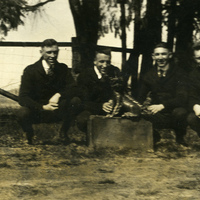 A photograph of four Pacific University students crouched around the Boxer mascot that is sitting on top of a suitcase. The original Boxer mascot was a gift to the school from a missionary named Reverend J. E. Walker. He acquired the Boxer while on a mission trip to China. The Boxer went missing after a Boxer Toss in 1969. This picture appears in an album that was compiled by Greta McIntyre Sheeley, a 1920 Pacific University graduate.