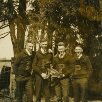 A photograph of four Pacific University students holding the Boxer mascot. The caption with the photograph identifies the students as Glenn Sheeley, Leslie Hoar, Harry Kunkel and John Garrigus. The original Boxer mascot was a gift to the school from a missionary named Reverend J. E. Walker. He acquired the Boxer while on a mission trip to China. The Boxer went missing after a Boxer Toss in 1969. This picture appears in an album that was compiled by Greta McIntyre Sheeley, a 1920 Pacific University graduate.