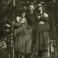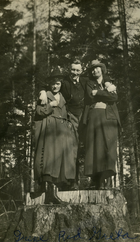 A photograph of three Pacific University students standing on a large stump. The caption with the photograph identifies the students as Irene Bilbrey, Glenn Sheeley and Greta McIntyre Sheeley. This picture appears in an album that was compiled by Greta McIntyre Sheeley, a 1920 Pacific University graduate.