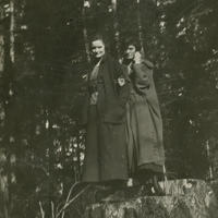 A photograph of two female Pacific University students standing on a large stump. The caption with the photograph identifies the students as Irene Bilbrey and Greta McIntyre Sheeley. This picture appears in an album that was compiled by Greta McIntyre Sheeley, a 1920 Pacific University graduate.