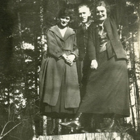 A photograph of three Pacific University students posing on a large stump. The caption with the photograph identifies the students as Irene Bilbrey, Taylor Graham and Greta McIntyre Sheeley. This picture appears in an album that was compiled by Greta McIntyre Sheeley, a 1920 Pacific University graduate.