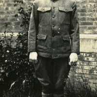 A photograph of a Pacific University student in a military uniform for Armistice Day. The caption with the photograph identifies the student as Glenn 'Red' Sheeley. During this time period many men from Pacific University were enlisted in military service as the United States entered World War I in April, 1917. The student body was almost entirely made up of women. This picture appears in an album that was compiled by Greta McIntyre Sheeley, a 1920 Pacific University graduate.