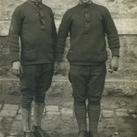 A photograph of a Pacific University student in military uniform, possibly overseas. The caption with the photograph identifies the student as Verle Stanley. According to the caption, Stanley was in possession of the Boxer mascot when he got called up to fight during World War I. He hid Boxer in Mrs. Brown's flour bin before he left. This picture appears in an album that was compiled by Greta McIntyre Sheeley, a 1920 Pacific University graduate.