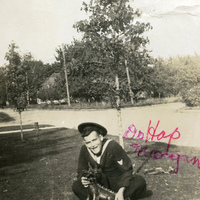 A photograph of a Pacific University student holding the Boxer mascot. The student is wearing his navy uniform. The caption with the photograph identifies the student as Samuel 'Hap' Morgan. The original Boxer mascot was a gift to the school from a missionary named Reverend J. E. Walker. He acquired the Boxer while on a mission trip to China. The Boxer went missing after a Boxer Toss in 1969. This picture appears in an album that was compiled by Greta McIntyre Sheeley, a 1920 Pacific University graduate.