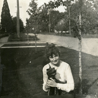 A photograph of a Pacific University student holding the Boxer mascot. Boxer is missing the tail. The caption with the photograph identifies the student as Greta McIntyre Sheeley. The original Boxer mascot was a gift to the school from a missionary named Reverend J. E. Walker. He acquired the Boxer while on a mission trip to China. The Boxer went missing after a Boxer Toss in 1969. This picture appears in an album that was compiled by Greta McIntyre Sheeley, a 1920 Pacific University graduate.