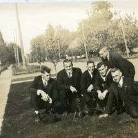 A photograph of a group of Pacific University students gathered around the Boxer mascot. Boxer is missing the tail. The original Boxer mascot was a gift to the school from a missionary named Reverend J. E. Walker. He acquired the Boxer while on a mission trip to China. The Boxer went missing after a Boxer Toss in 1969. This picture appears in an album that was compiled by Greta McIntyre Sheeley, a 1920 Pacific University graduate.