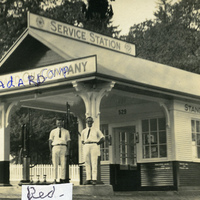 A photograph of a Pacific University student standing outside of a Standard Oil Company gas station. He is dressed in the Standard white uniform with a black tie. The caption identifies the student as Glenn Sheeley. This picture appears in an album that was compiled by Greta McIntyre Sheeley, a 1920 Pacific University graduate.