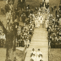 A photograph of the procession at the May Day celebration in 1917. The May Day celebration tradition at Pacific University began in 1914, and would continue for over 50 years. A student would be crowned 'Queen of the May'. The event would often include a double-line procession from the Carnegie Library to the west side of Marsh Hall. A luncheon, singing, athletic competitions and other activities would be enjoyed by students and members of the Forest Grove community. A maypole would be erected and young ladies dressed in white would wind ribbon around it. This picture appears in an album that was compiled by Greta McIntyre Sheeley, a 1920 Pacific University graduate.