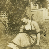 A photograph the the May Queen of 1917, Alvena Howard. The May Day celebration tradition at Pacific University began in 1914, and would continue for over 50 years. A student would be crowned 'Queen of the May'. The event would often include a double-line procession from the Carnegie Library to the west side of Marsh Hall. A luncheon, singing, athletic competitions and other activities would be enjoyed by students and members of the Forest Grove community. A maypole would be erected and young ladies dressed in white would wind ribbon around it. This picture appears in an album that was compiled by Greta McIntyre Sheeley, a 1920 Pacific University graduate.
