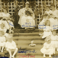 A photograph of the May Queen sitting in front of a decorated Marsh Hall with the May Day court and a group of children in 1917. A lattice backdrop had been placed on the front porch of Marsh Hall and had been decorated with flowers and greenery. Rugs were laid out on the Marsh Hall steps. The caption with the photograph identifies Queen Alvena Howard, Morieta Howard, Helen Brunner, Dorris Mace, Irene Robinson and Betty Clark. The May Day celebration tradition at Pacific University began in 1914, and would continue for over 50 years. A student would be crowned 'Queen of the May'. The event would often include a double-line procession from the Carnegie Library to the west side of Marsh Hall. A luncheon, singing, athletic competitions and other activities would be enjoyed by students and members of the Forest Grove community. A maypole would be erected and young ladies dressed in white would wind ribbon around it. This picture appears in an album that was compiled by Greta McIntyre Sheeley, a 1920 Pacific University graduate.