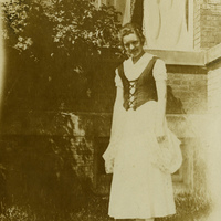 A photograph of a Pacific University student dressed up for the May Day Celebration. She is wearing a dirndl style dress. The caption with the photograph identifies the student as Greta McIntyre Sheeley. The May Day celebration tradition at Pacific University began in 1914, and would continue for over 50 years. A student would be crowned 'Queen of the May'. The event would often include a double-line procession from the Carnegie Library to the west side of Marsh Hall. A luncheon, singing, athletic competitions and other activities would be enjoyed by students and members of the Forest Grove community. A maypole would be erected and young ladies dressed in white would wind ribbon around it. This picture appears in an album that was compiled by Greta McIntyre Sheeley, a 1920 Pacific University graduate.