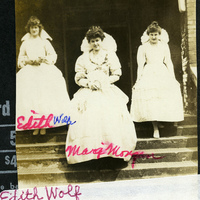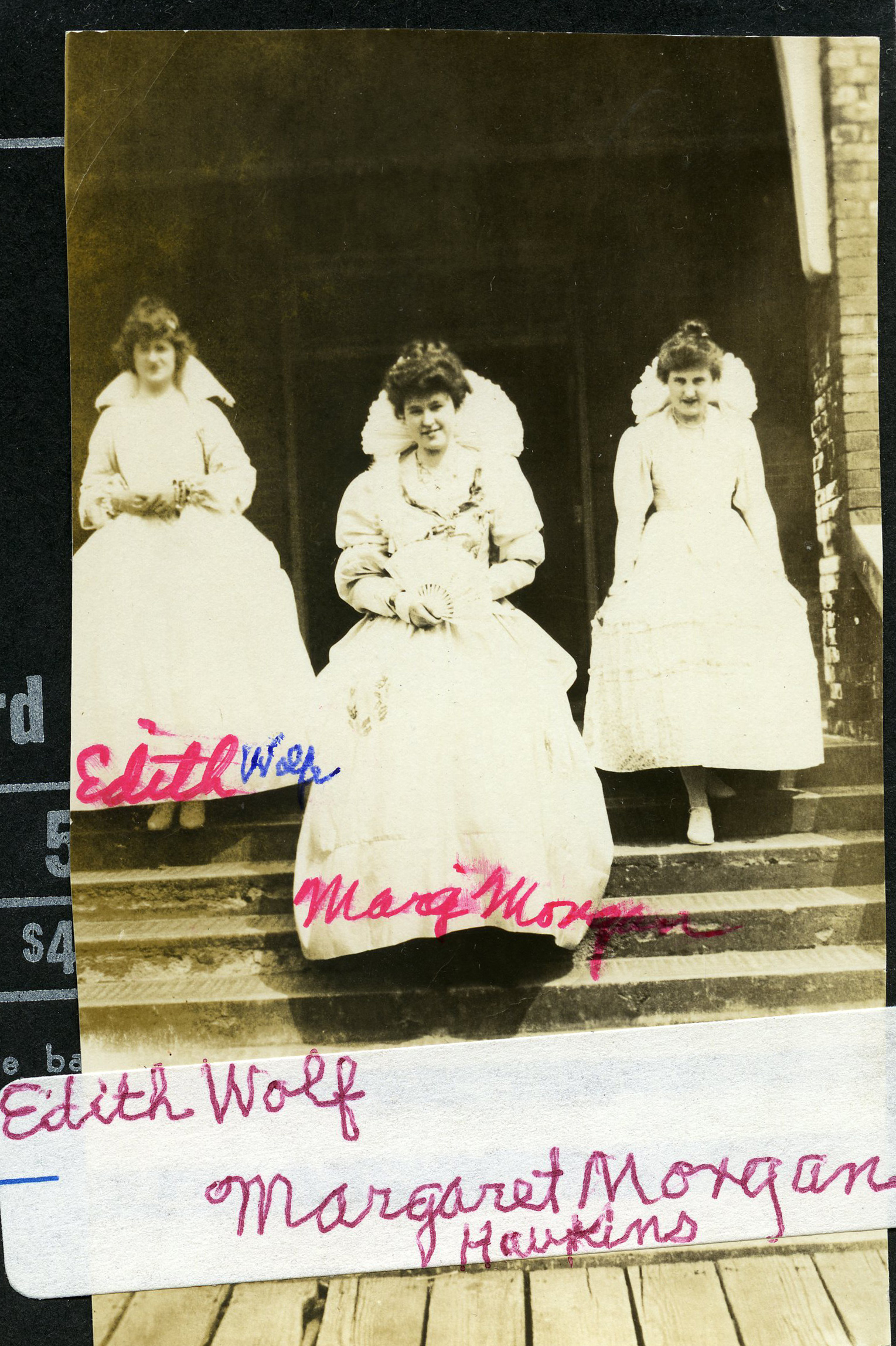 A photograph of three Pacific University students that are dressed in Elizabethan style dresses for the May Day celebration in May, 1918. The women are standing in front of second Herrick Hall. The caption with the photograph identifies two of the women as Margaret Morgan and Edith Wolfe. The May Day celebration tradition at Pacific University began in 1914, and would continue for over 50 years. A student would be crowned 'Queen of the May'. The event would often include a double-line procession from the Carnegie Library to the west side of Marsh Hall. A luncheon, singing, athletic competitions and other activities would be enjoyed by students and members of the Forest Grove community. A maypole would be erected and young ladies dressed in white would wind ribbon around it. This picture appears in an album that was compiled by Greta McIntyre Sheeley, a 1920 Pacific University graduate.