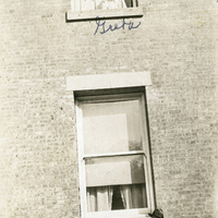 A photograph of two Pacific University students standing below a second story window of second Herrick Hall, while a young woman looks down at them. The caption with the photograph identifies the students as Verle Stanley, Tom Todd and Greta McIntyre Sheeley. Herrick Hall was the second women's dormitory on the Pacific University campus. It was built in 1907 after it's predecessor burned down. This picture appears in an album that was compiled by Greta McIntyre Sheeley, a 1920 Pacific University graduate.