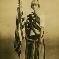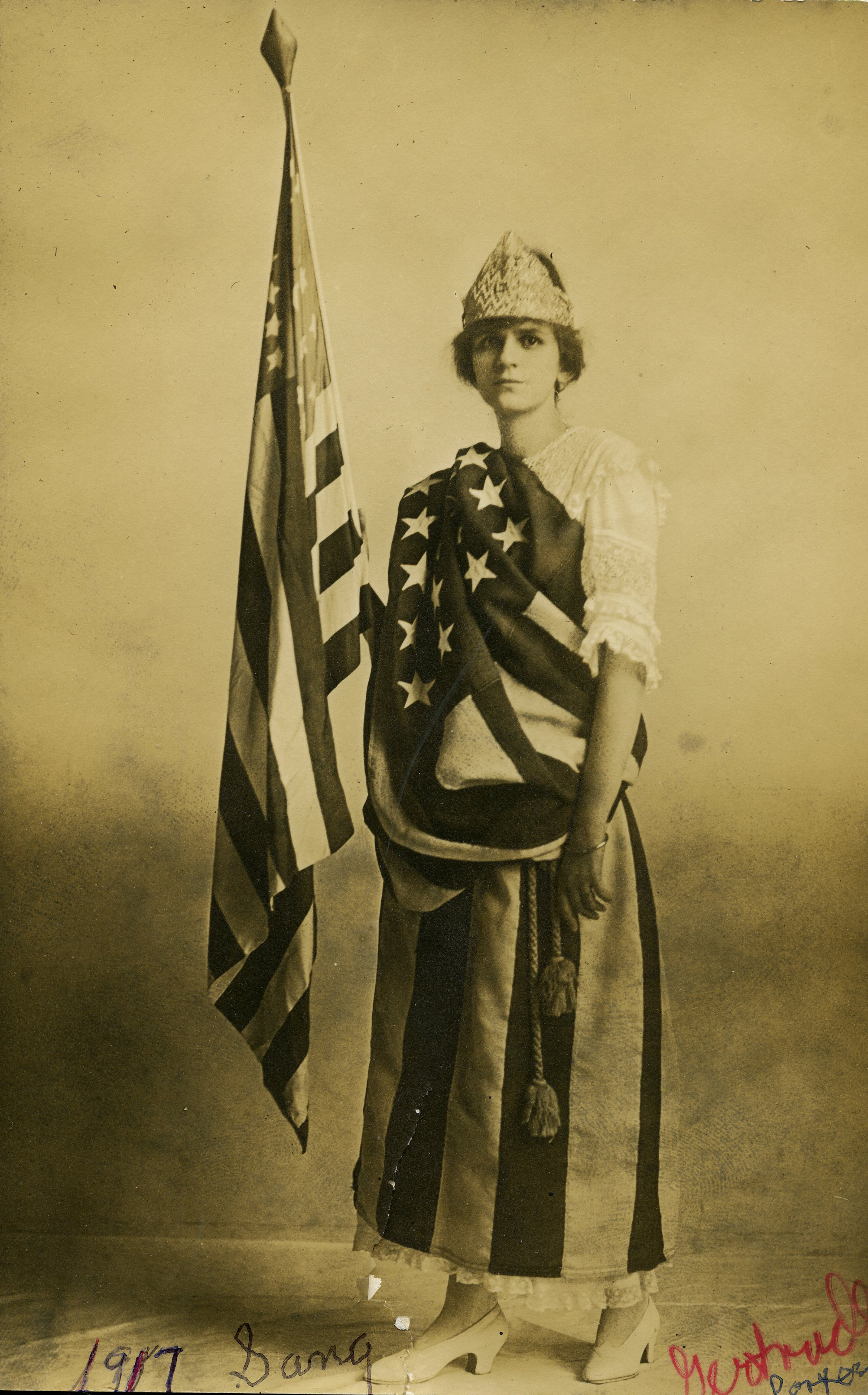 A portrait of Pacific University student, Gertrude Porter. She is wrapped in an American flag and wearing a crown. The caption with the photograph indicates that she sold World War I bonds. During this time period many men from Pacific University were enlisted in military service as the United States entered World War I in April, 1917. The student body was almost entirely made up of women. This picture appears in an album that was compiled by Greta McIntyre Sheeley, a 1920 Pacific University graduate.
