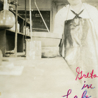 A photograph of a student in the science lab at Pacific University. The caption with the photograph identifies the student as Greta McIntyre Sheeley. During the time this picture was taken, science classes would have been held in Science Hall, today known as Old College Hall. Old College Hall is the oldest building on the Pacific University campus and one of the oldest educational buildings in the western United States. This picture appears in an album that was compiled by Greta McIntyre Sheeley, a 1920 Pacific University graduate.