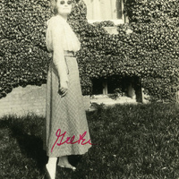 A photograph of a Pacific University student wearing sunglasses, posing next to Marsh Hall. The caption with the photograph identifies the student as Greta McIntyre Sheeley. In 1920, Marsh Hall served as the university's chapel, recitation rooms, office and rooms for the literary societies and the Christian Associations. This picture appears in an album that was compiled by Greta McIntyre Sheeley, a 1920 Pacific University graduate.
