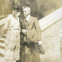 A photograph of two Pacific University students standing next to the steps of second Herrick Hall. The caption with the photograph identifies them as Verle Stanley and Rozella McKee. It also indicates that the two eventually married. Herrick Hall was the second women's dormitory on the Pacific University campus. It was built in 1907 after it's predecessor burned down. This picture appears in an album that was compiled by Greta McIntyre Sheeley, a 1920 Pacific University graduate.