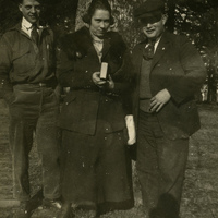 A photograph of three Pacific University students dressed in formal clothes. The students are posing outside a grove of trees. The caption with the photograph identifies two of the students as Orlando Romig and Alice Bollinger. It also indicates that Orlando Romig and Alice Bollinger would later get married. This picture appears in an album that was compiled by Greta McIntyre Sheeley, a 1920 Pacific University graduate.