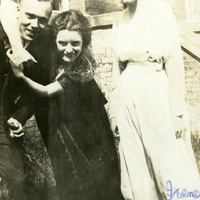 A photograph of three Pacific University students on campus. A young woman has a young man in a headlock while another young woman looks on. The caption with the photograph identifies the students as Harvey Jack, Greta McIntyre and Irene Bilbry. The caption also notes, 'Married with Greta's help'. This picture appears in an album that was compiled by Greta McIntyre Sheeley, a 1920 Pacific University graduate.