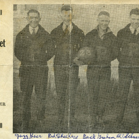 A photograph of the 1920-1921 Pacific University basketball team. The caption with the photograph identifies the students as Leslie 'Jazz' Hoar, Glenn 'Red' Sheeley, W. T. 'Buck' Graham, Albert Schneider and Henry Fiske. This picture appears in an album that was compiled by Greta McIntyre Sheeley, a 1920 Pacific University graduate.