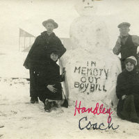 A photograph of four Pacific University students posed around a snowman, after a recent snowfall. The bottom of the snowman has the message 'In Memory Our Boy Bill'. This picture appears in an album that was compiled by Greta McIntyre Sheeley, a 1920 Pacific University graduate.