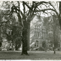 A photograph of the west entrance of Marsh Hall. Marsh Hall served as the university's chapel, recitation rooms, office and rooms for the literary societies and the Christian Associations. This picture appears in an album that was compiled by Greta McIntyre Sheeley, a 1920 Pacific University graduate.
