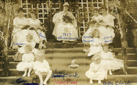 A photograph of the May Queen sitting in front of a decorated Marsh Hall with the May Day court and a group of children in 1917. A lattice backdrop had been placed on the front porch of Marsh Hall and had been decorated with flowers and greenery. Rugs were laid out on the Marsh Hall steps. The caption with the photograph identifies Queen Alvena Howard, Morieta Howard, Helen Brunner, Dorris Mace, Irene Robinson and Betty Clark. The May Day celebration tradition at Pacific University began in 1914, and would continue for over 50 years. A student would be crowned 'Queen of the May'. The event would often include a double-line procession from the Carnegie Library to the west side of Marsh Hall. A luncheon, singing, athletic competitions and other activities would be enjoyed by students and members of the Forest Grove community. A maypole would be erected and young ladies dressed in white would wind ribbon around it. This picture appears in an album that was compiled by Greta McIntyre Sheeley, a 1920 Pacific University graduate.
