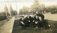A photograph of a group of Pacific University students gathered in the grass around the Boxer mascot. Boxer is missing the tail. The caption with the photograph identifies the students as Julian Fenenga, Orlando Romig, Verle Stanley, Greta McIntyre, Byron Goodman and Harold Reed The original Boxer mascot was a gift to the school from a missionary named Reverend J. E. Walker. He acquired the Boxer while on a mission trip to China. The Boxer went missing after a Boxer Toss in 1969. This picture appears in an album that was compiled by Greta McIntyre Sheeley, a 1920 Pacific University graduate.