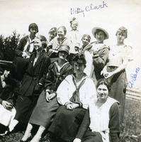 A photograph of Betty Clark, daughter of President Robert Fry Clark, with a group of Pacific University students at a picnic. Students affectionately called her Sunshine according to a caption with the photograph. Many of the students are dressed in sailor type dresses. During this time period many men from Pacific University were enlisted in military service as the United States entered World War I in April, 1917. The student body was almost entirely made up of women. This picture appears in an album that was compiled by Greta McIntyre Sheeley, a 1920 Pacific University graduate.