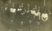 A photograph of the cast of Pacific University's play Pygmalion and Galatea posing next to Marsh Hall in 1919. The Philomathean Society of Pacific University put on the production in an effort to support two French orphans. The play was performed in Marsh Hall on April 10th, 1919. The Philomathean Society at Pacific University was founded in 1871. They believe they are the oldest sorority west of the Mississippi. This picture appears in an album that was compiled by Greta McIntyre Sheeley, a 1920 Pacific University graduate.
